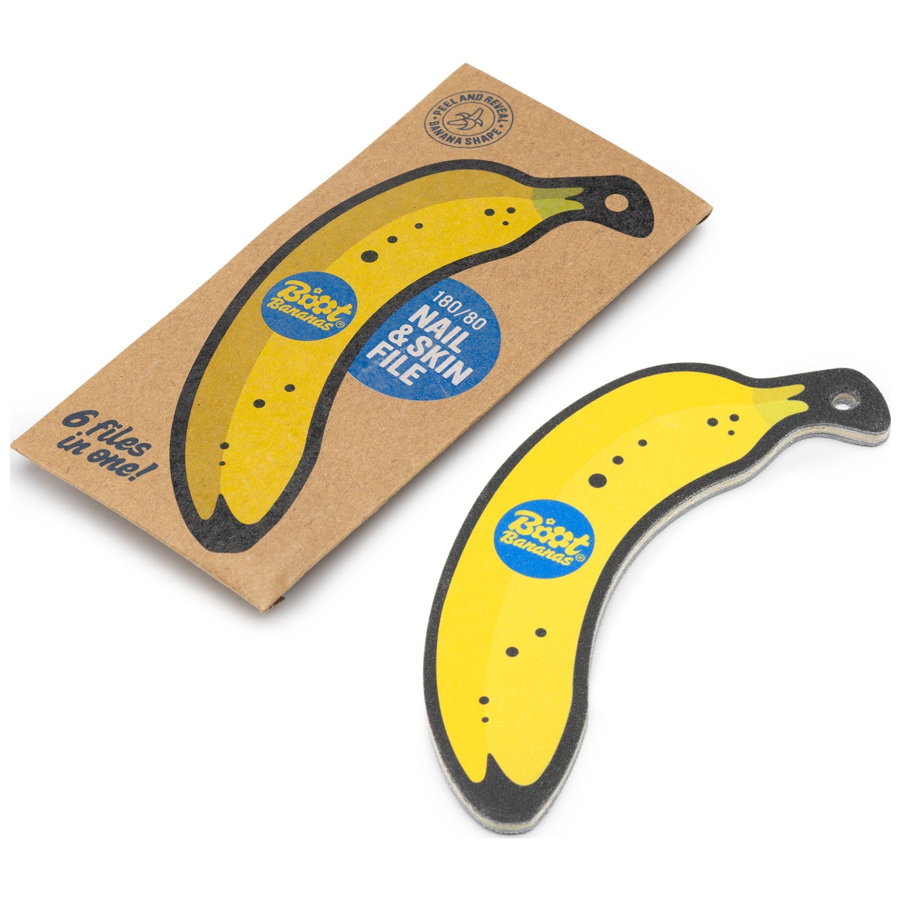 Double-sided banana shape file with a fine 180 grit for nails and a rough 80 grit for skin.